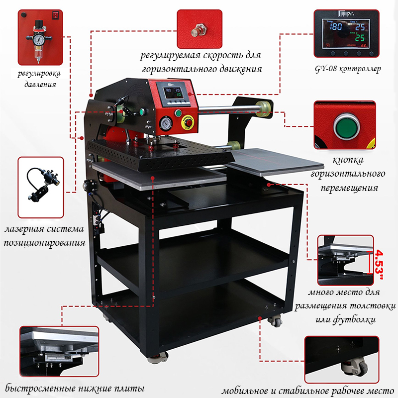 GY-08 Цифровое время и температура. Контроль: Удобная цифровая панель управления позволяет точно регулировать время, температуру и давление, позволяя настроить процесс теплопередачи в соответствии с различными материалами.