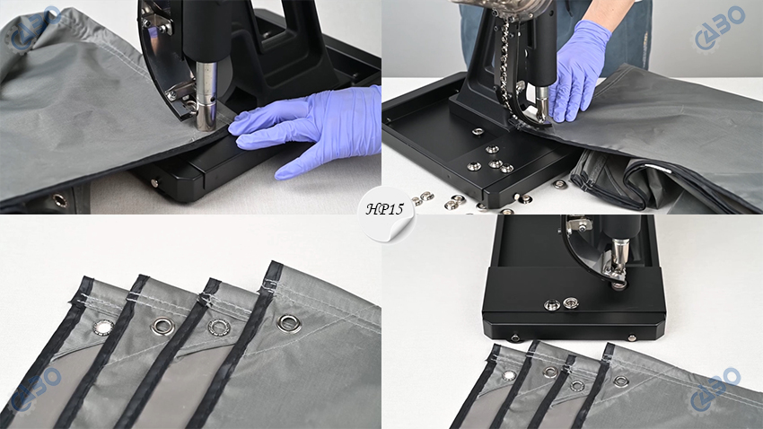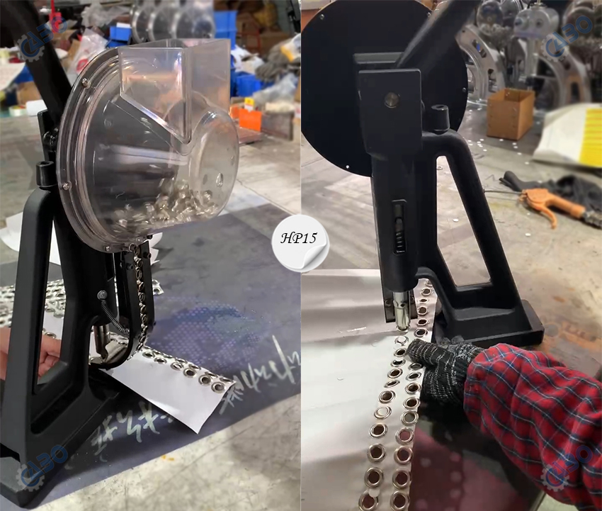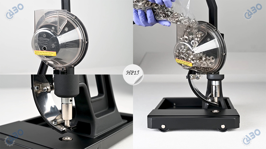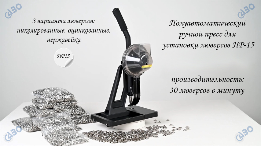 Полуавтоматический ручной пресс для люверсов HP-15 быстро и легко устанавливает люверсы в различные материалы: