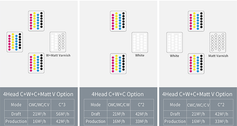 Производительность зависит от количества печатных голов и цветовой конфигурации и выбора качества печати: высокопроизводительный: 56 м2/ч, производительный: средний 36 м2/ ч.